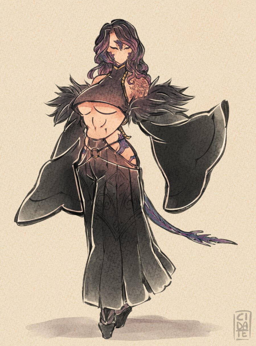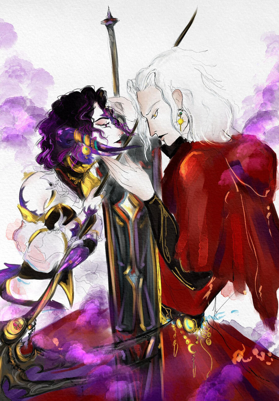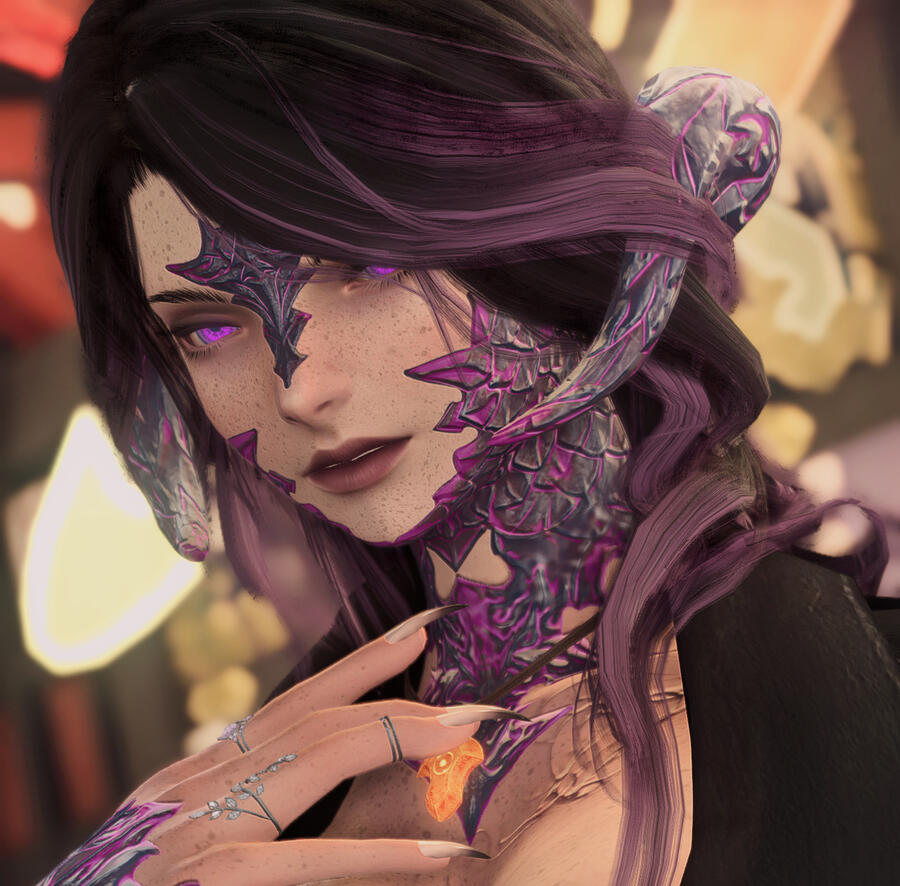 Selene was born on the Azim Steppe, but left as a teenager and moved to Kugane. Selene is self-preserving as she had to learn to be ruthless to survive. She bases her morality and decisions in life based on whether it will benefit her or fits her personal sense of justice, and may not always look morally right to an outsider. Selene is logical to a fault, but does work to understand the feelings and logic of others. As the warrior of light, she has found new solace in helping others, even if she would like to escape duty and contracts and live for herself.Selene encountered her reaper avatar, the thirteenth shard of Azem, as a young child when she discovered a void portal. This event also led to her being an outcast and growing unusual purple marbled scales. She did not grow to understand how to work with her avatar and be a Reaper until after the events of Stormblood and before going to the first. Before this she had trained as a Samurai when living in Kugane and then a Dragoon while living in Ishgard.Currently, Selene lives in Ishgard where she can be close to some of her dear friends and adopted family, such as Aymeric and the Fortemps, and she can enjoy her life with her soulbonded partner and their best friend who have returned to her to live again, for themselves rather than duty this time.