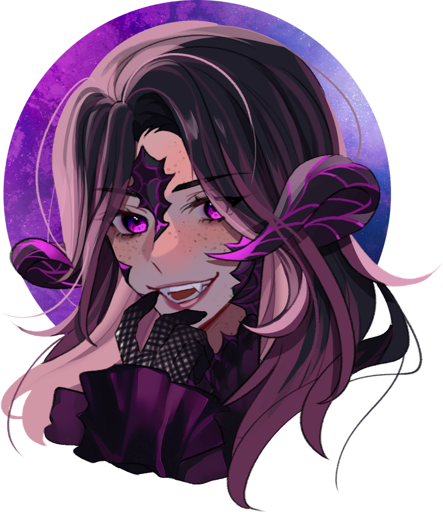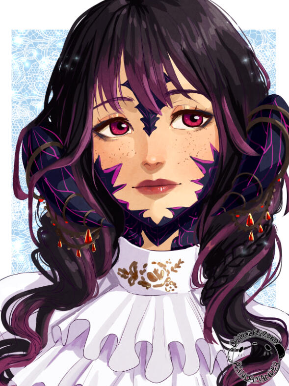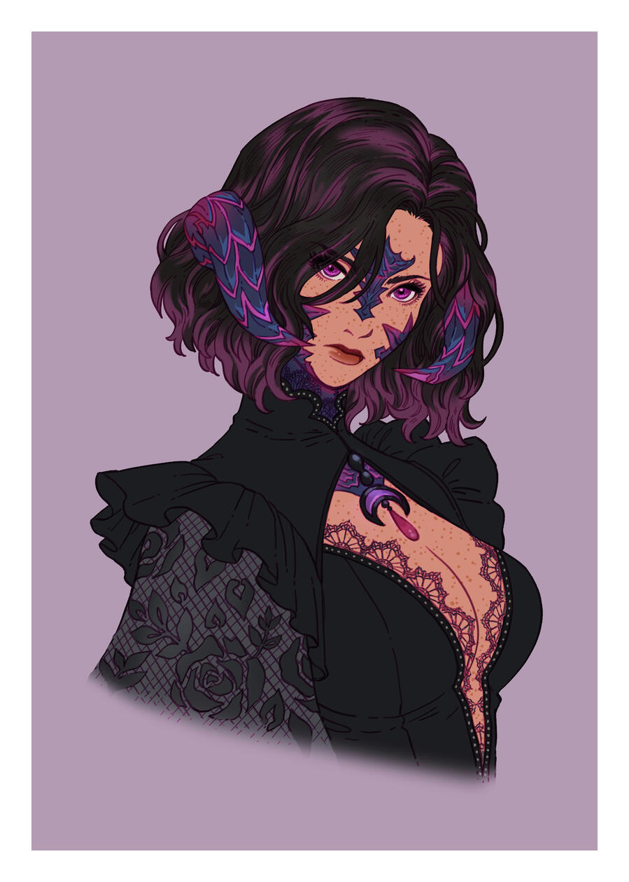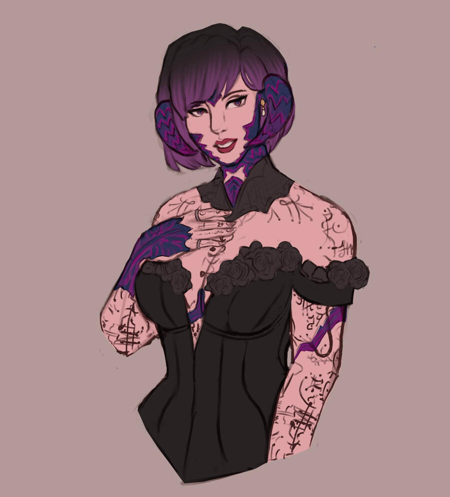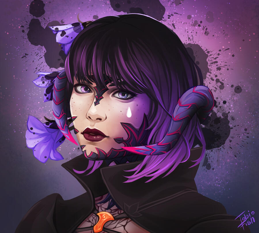 Hair: black and fades to purple (naturally black, but turned purple at the ends after she was attacked and as she shares aether with Ophelia), she often chops it off short for practicality. Sometimes she will grow it out and put it in a high ponytail or shape it into waves.