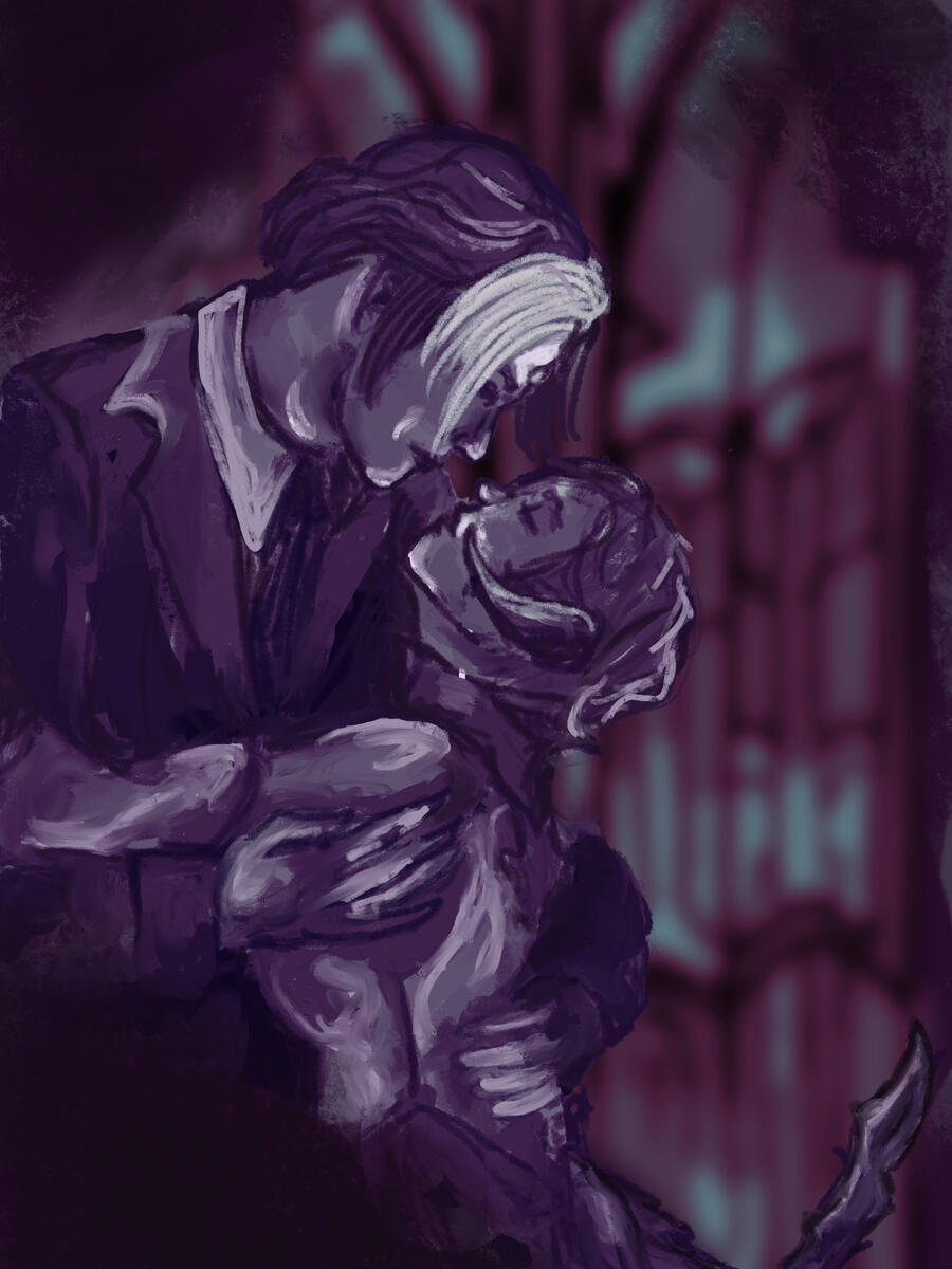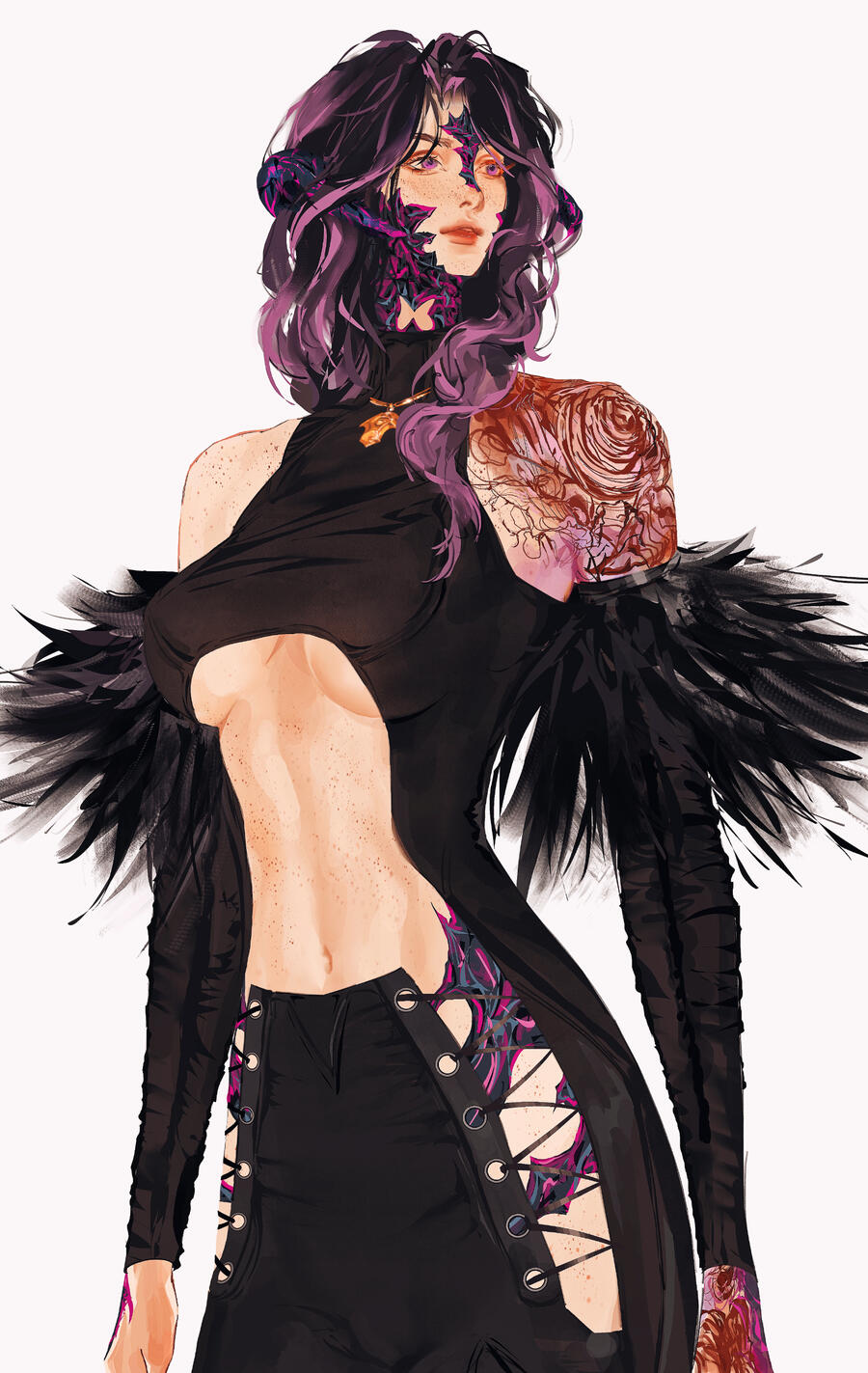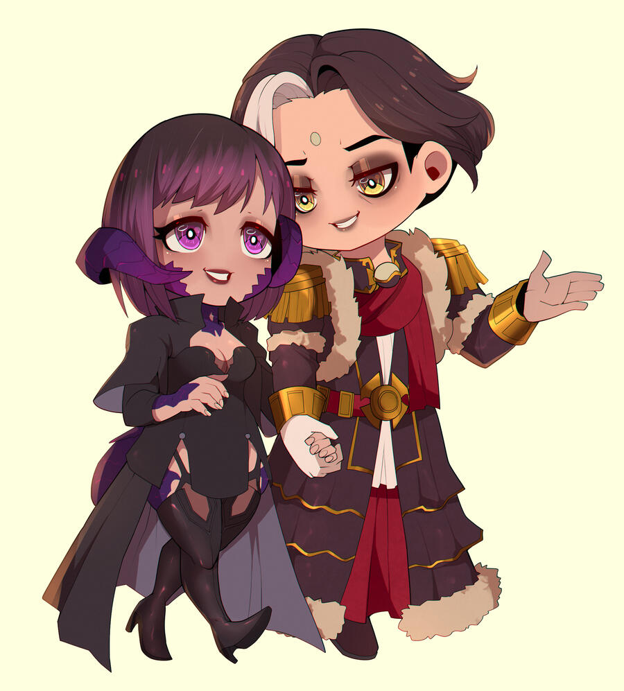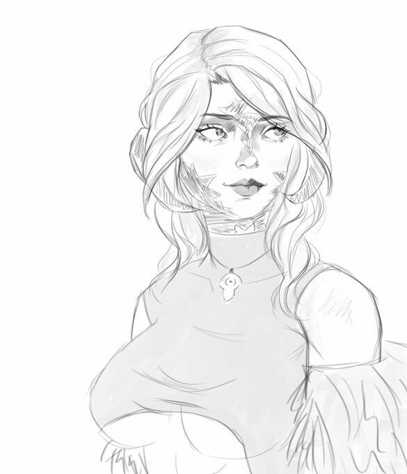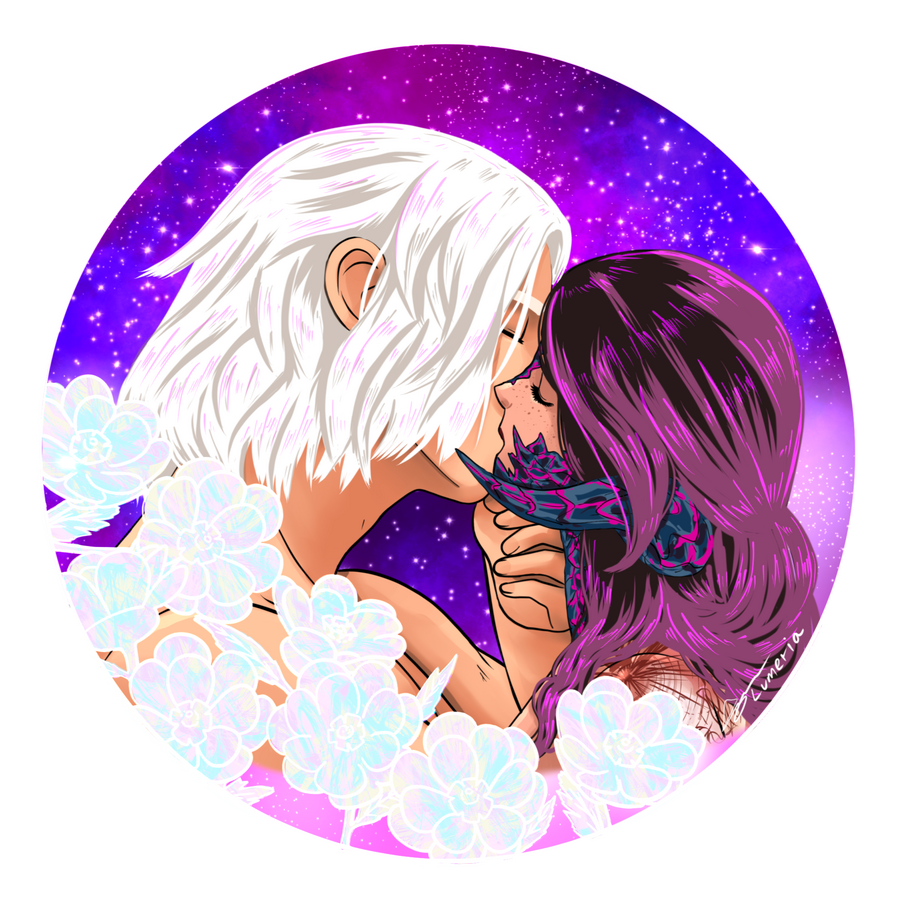 Hair: black and fades to purple (naturally black, but turned purple at the ends after she was attacked and as she shares aether with Ophelia), she often chops it off short for practicality. Sometimes she will grow it out and put it in a high ponytail or shape it into waves.